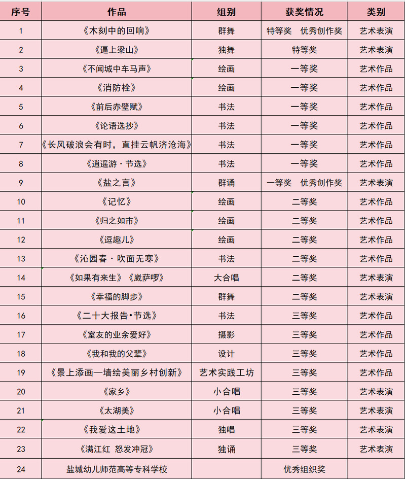 在近期公布的江苏省第七届大学生艺术展演活动评选结果中,我校在各项比赛中大丰收,荣获特等奖2项,一等奖7项,二等奖6项,三等奖8项,优秀创作奖2项,学校首次获优秀组织奖,共计获奖26项,创下了获奖数量最多的新记录!