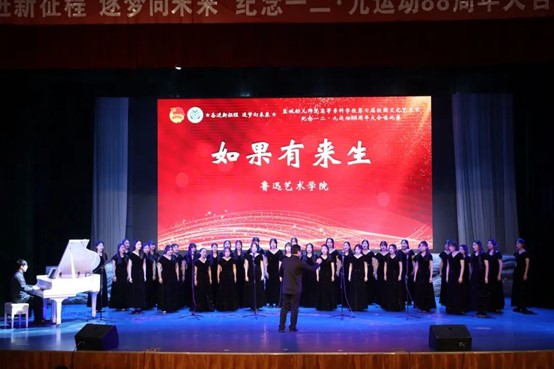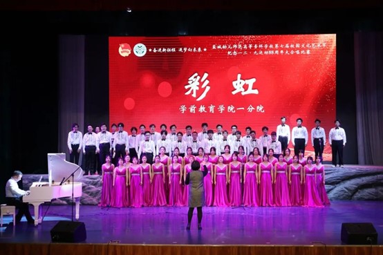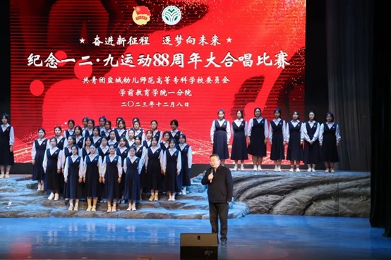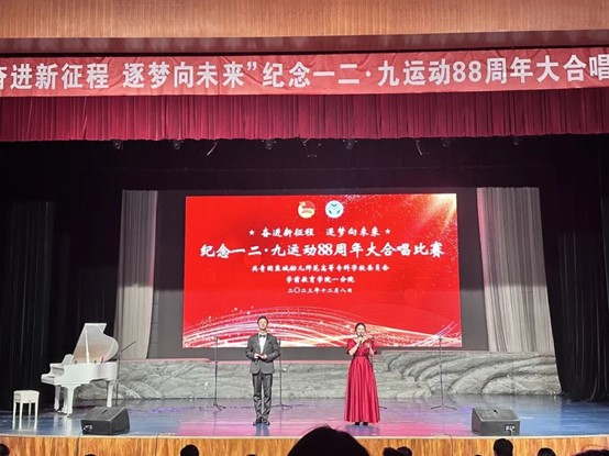 赓续红色血脉,唱响青春华章。为纪念“一二·九”运动88周年,引领我校学生深刻了解历史、铭记历史,培养爱党、爱国、爱校情怀,12月8日下午,由校团委主办、学前教育学院一分院承办的“奋进新征程 逐梦向未来”纪念“一二•九”运动88周年大合唱比赛在鲁艺剧场隆重举行。校党委委员、副校长戴永湖、各学院党总支书记、分管学生工作副书记、团总支书记等出席比赛。