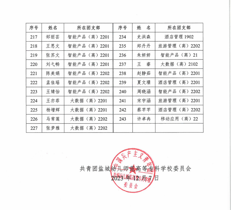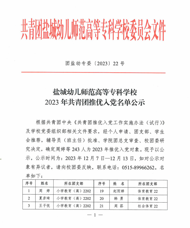 团盐幼专委〔2023〕22号-盐城幼儿师范高等专科学校2023年共青团推优入党名单公示