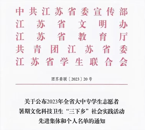 近日,中共江苏省委宣传部、江苏省文明办、江苏省教育厅、共青团江苏省委、江苏省学生联合会联合开展的2023年全省大中专学生志愿者暑期文化科技卫生“三下乡”社会实践活动表彰中,我校荣获“社会实践优秀团队”“社会实践先进个人”“社会实践先进工作者”“社会实践优秀调研报告”等多项荣誉。