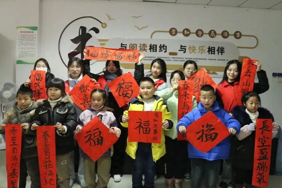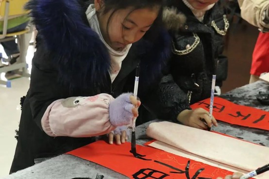 红纸黑字,“福”到人间。盐青柚志愿者们带领孩子们来到桌前,手把手示范教学——一笔一墨,一撇一捺。一双双执笔的手书写新春的祝福,一张张灿烂的笑靥捧起红纸,盐青柚们和孩子们一起,浸润优秀传统文化,共同续写美好祝福。