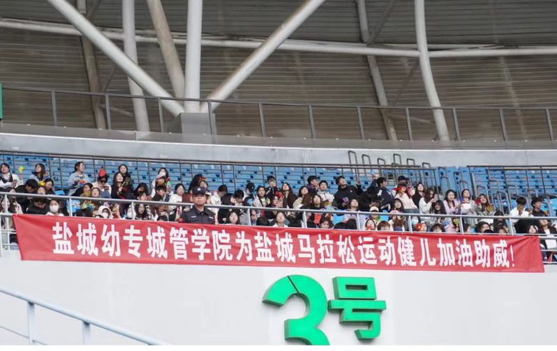 早上7:00,作为马拉松观众的盐城幼专学子在老师带领下,步行前往盐城市奥林匹克体育中心体育馆主馆,到达之后,大家有序落座。在看到向场馆内奔跑的选手们时,盐幼专学子卖力鼓掌拍手加油,为选手提供精神鼓励。同学们的热情欢呼充斥着整个场馆,告诉选手们,“勇敢向前奔跑,我们在身后支持着你们。”