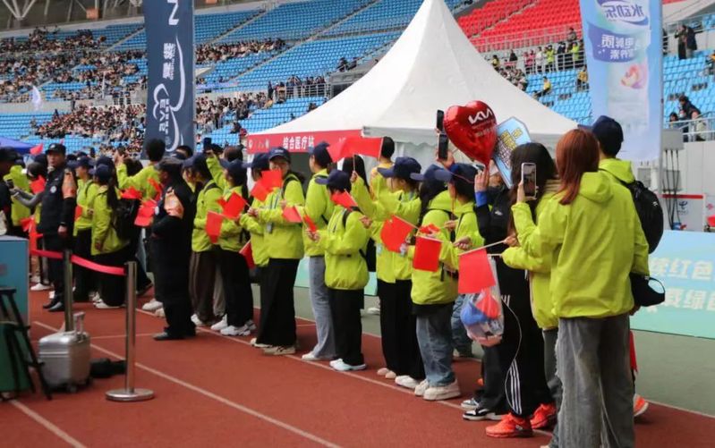 在激情奔跑的背后,一群少年辛勤工作,为安全比赛默默付出。他们就是盐城幼专马拉松服务志愿者。