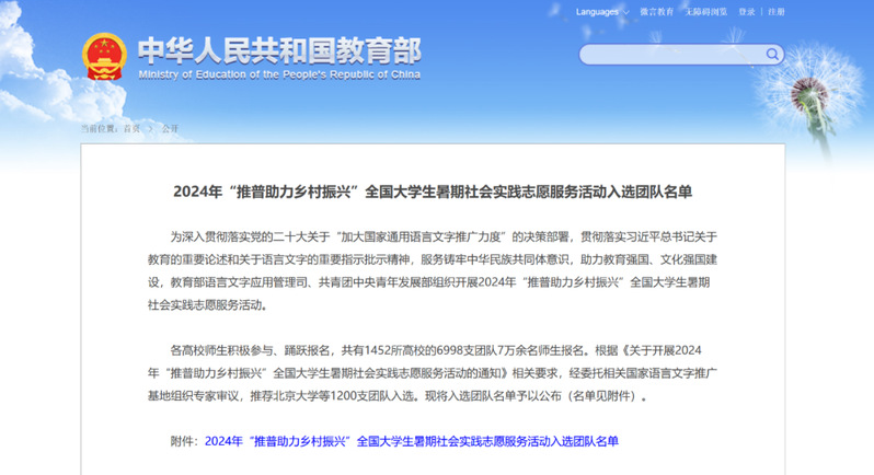 为深入贯彻落实党的二十大关于“加大国家通用语言文字推广力度”的决策部署,贯彻落实习近平总书记关于教育的重要论述和关于语言文字的重要指示批示精神,服务铸牢中华民族共同体意识,助力教育强国、文化强国建设,教育部语言文字应用管理司、共青团中央青年发展部组织开展2024年“推普助力乡村振兴”全国大学生暑期社会实践志愿服务活动。