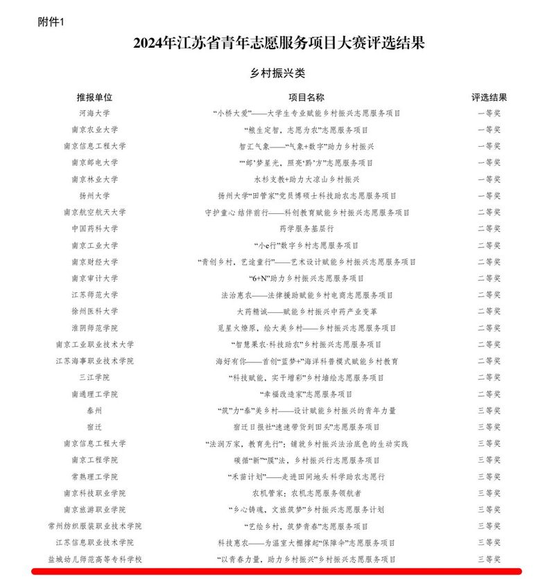 此次活动得到了各高校师生的广泛关注和积极参与,经过严格的资格审核、材料阅评、路演答辩等程序,近期对获奖项目进行了公示。我校城市管理学院“以青春力量、助力乡村振兴”乡村振兴志愿服务项目脱颖而出,荣获2024年江苏省青年志愿服务大赛三等奖。