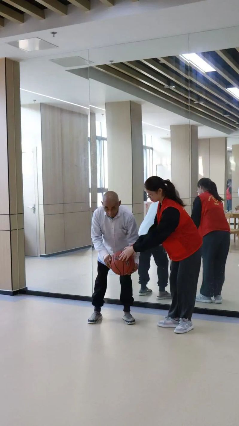 老人们与志愿者利用滚篮球的方式击打水瓶,击倒水瓶数量多的即为胜出。志愿者们的倾力指导,使活动有序而平稳地进行着。在娱乐过程中,尽管有些老人手脚不甚灵活,但仍然积极参与。老人们的脸上洋溢着笑容。活动的气氛也被推向高潮。