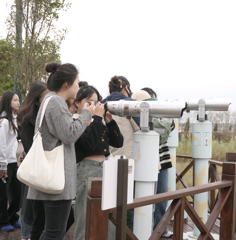 同学们不仅参观了景区内丰富的自然景观,如“两分水”、“一线潮”等,以及由水杉、银杏、杨树和竹林等植物打造出的绿色长廊和多个生态景点,而且还通过望远镜观鸟,实地观察鸟类习性以及真实感受自然生态之美和历史文化的厚重。