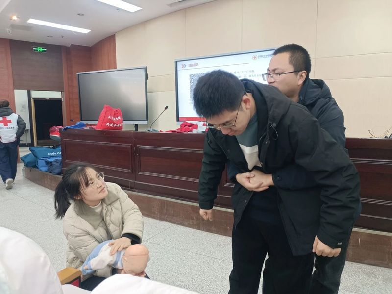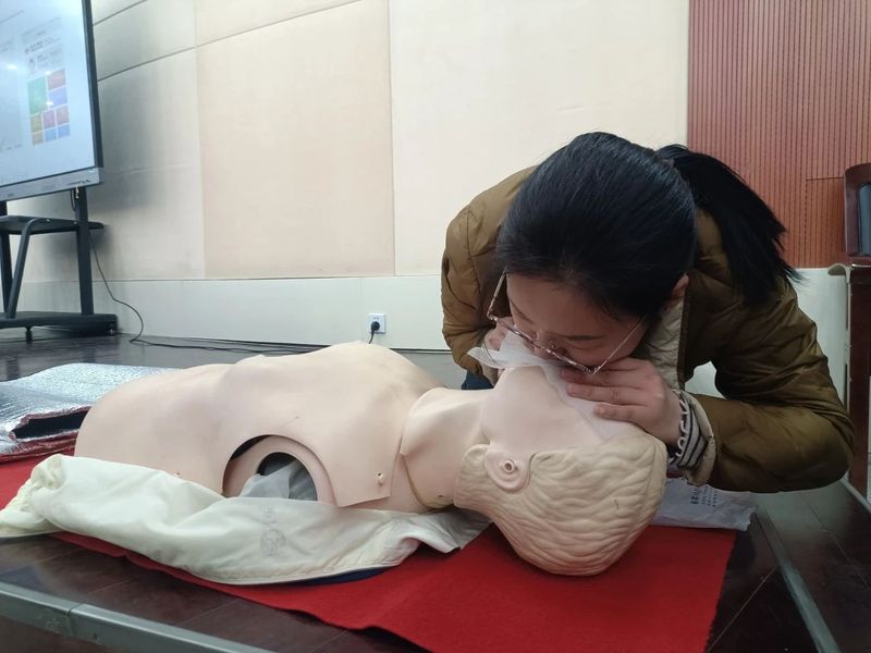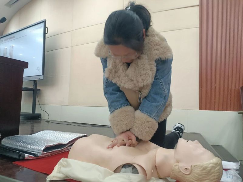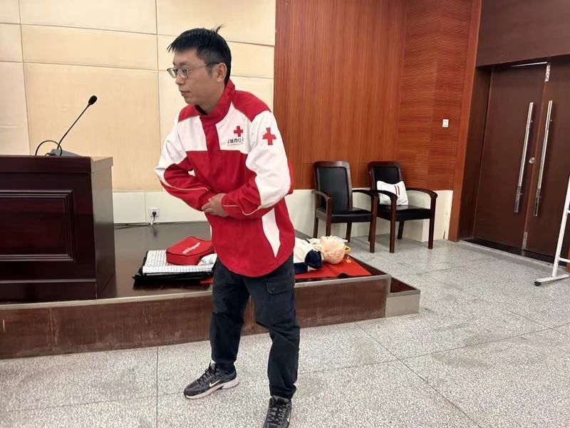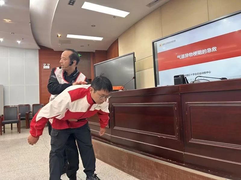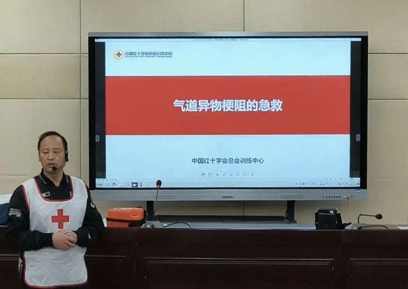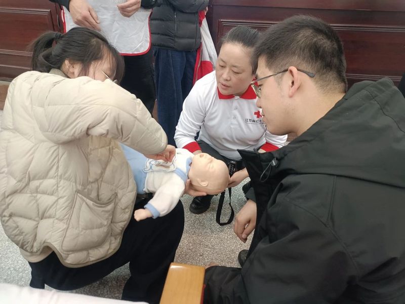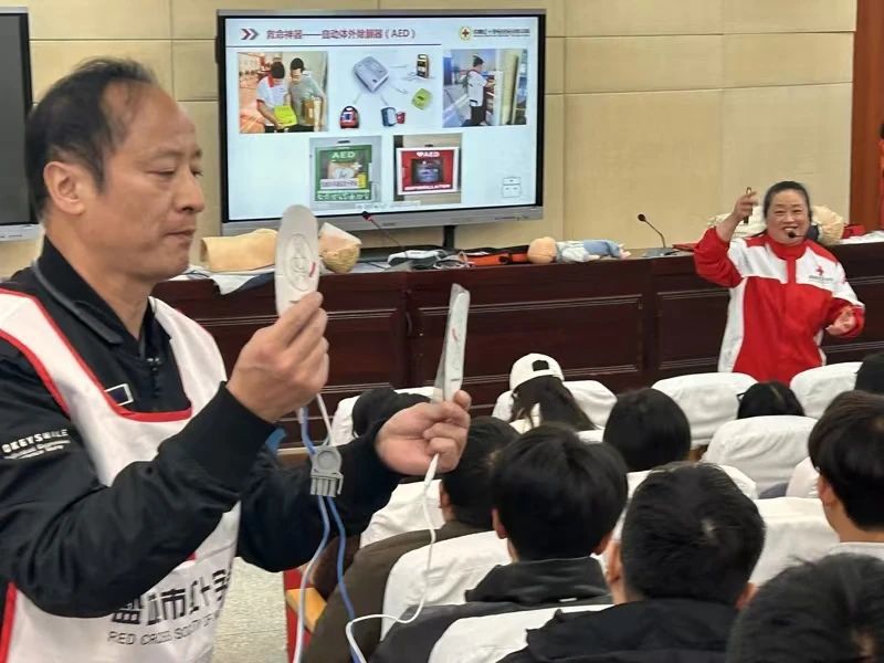 讲师为师生们详细讲解了应急救护理念,并且用通俗易懂的语言,生动具体的案例向学员们讲解了心肺复苏、AED使用、气道异物梗阻急救核心内容。为了让大家更加全面掌握应急救护要领,红十字会救护人员通过现场操作,将理论与实践相结合,现场指导学员们并且演示了操作流程和技术要领,使学员们将急救处理流程的每一个步骤、每一个细节牢记于心。