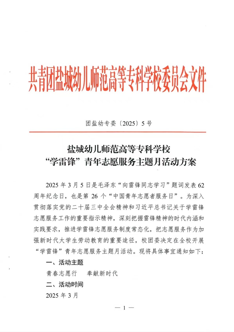 团盐幼专委〔2025〕5 号-盐城幼儿师范高等专科学校“学雷锋”青年志愿服务主题月活动方案
