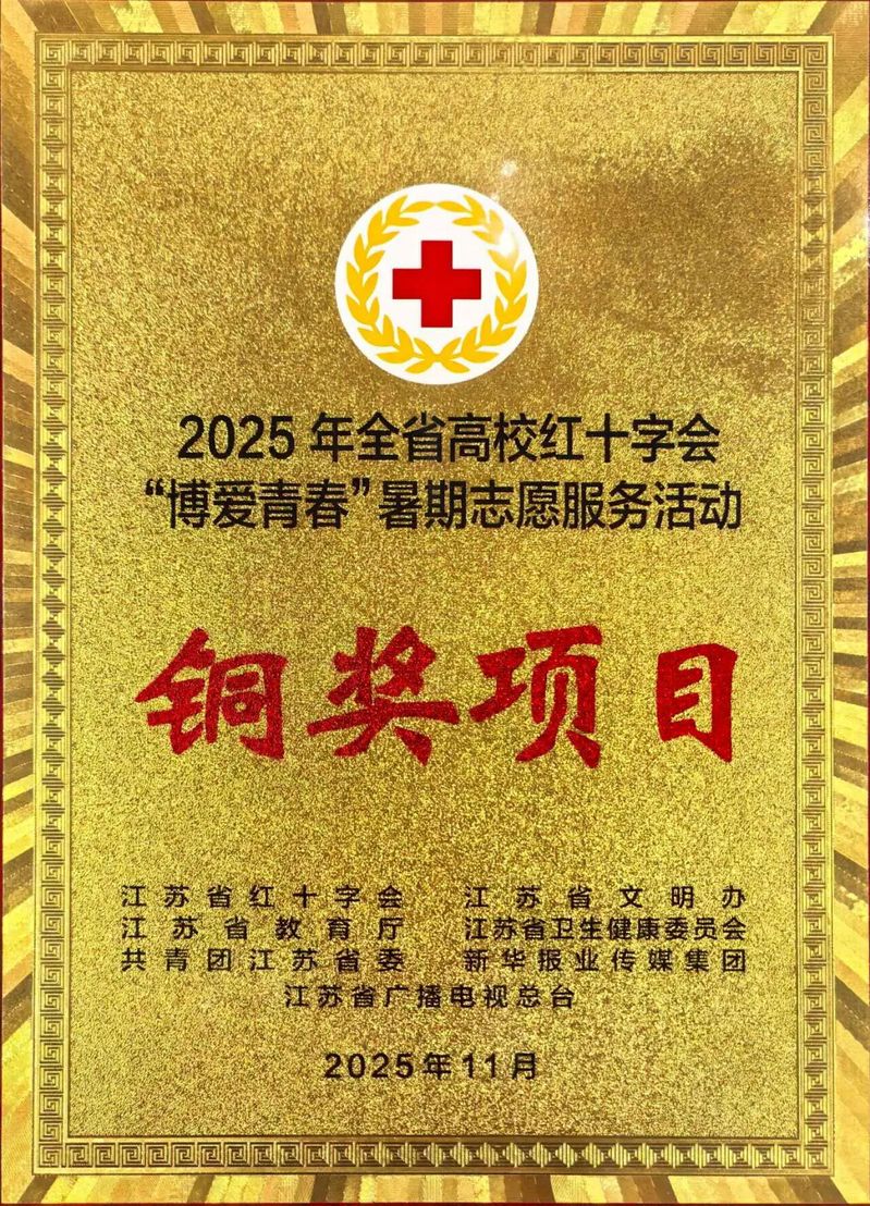 11月27日,江苏省红十字会、江苏省委宣传部、省委社会工作部、省教育厅、省卫健委、团省委在南京举办了2025年全省高校红十字会“博爱青春”暑期志愿服务总结展示活动。我校申报的“心光同行——特需群体心理赋能青春行动”凭借着创新表达性艺术心理辅导与构建大中小一体化心理育人的格局,在评选中脱颖而出,荣获省级铜奖。